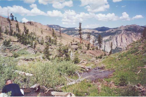 Unfortunately, I made the mistake of taking off my shoes and socks to look at my blisters. By this point, there was basically no skin left on my heels. I had blisters a good 2 by 2 inches square on each heel. Well, "blisters" is probably not the right word, as that would imply there was still some skin. Aside from the heels, the small, 1/4" diameter blister on the side of my right big toe had grown to the diameter of a penny by lunch, and looked like a sixth toe. Combine the blisters with another round of nausea, and it was obvious we were in trouble. But we were still scheduled to go another 6 miles that day, and 15 the next... We realized this was insane and we weren't gonna make it since I couldn't really walk, so we decided to try to get to Blue Lakes (a bit past our supposed Tamarack Lake camping spot for that night) and call my parents for a ride.