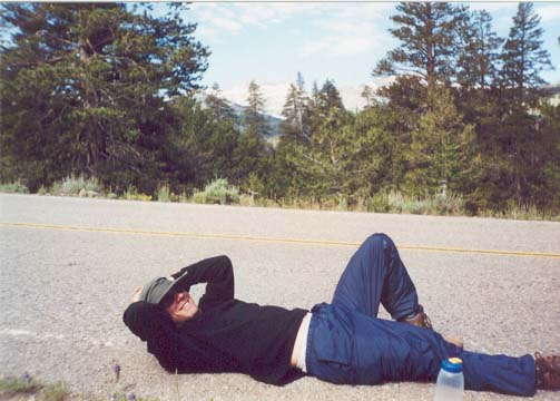 My feet killing me beyond belief, and all motivation and hope disintegrating quickly, we trudged on. Somewhere around mile 6, we had to take a break. Justin decided the road looked like a good place to kick it.