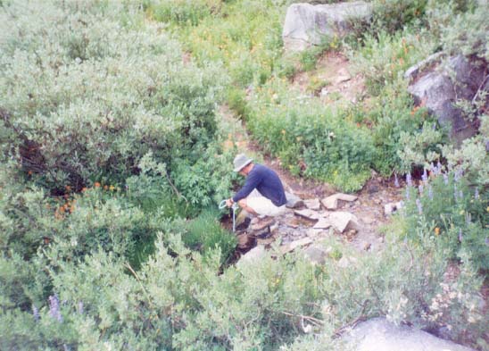 We made it all of a few hundred yards down the trail, and Justin decided he'd better filter some water from the outlet creek of one of the lakelets because he didn't have enough to make it to Frog Lake. I'd say the purity of the water was questionable. I watched from the top of a boulder, for no good reason except that it seemed like maybe there were a few less mosquitoes up there...