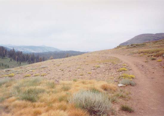 While Justin perused the visitor's center, I took the opportunity to re-tape my feet, which were starting to blister a bit on the heels. To my delight, they were not (yet) as bad as they felt, so I slapped on some blister treatment pads and got ready to go again. Shortly, we took off on the trail (really the highway for a quarter mile or so) again. Aside from being sore, I wasn't feeling too bad. But then we started climbing up over the ridge that separated us from Upper Truckee River Canyon.