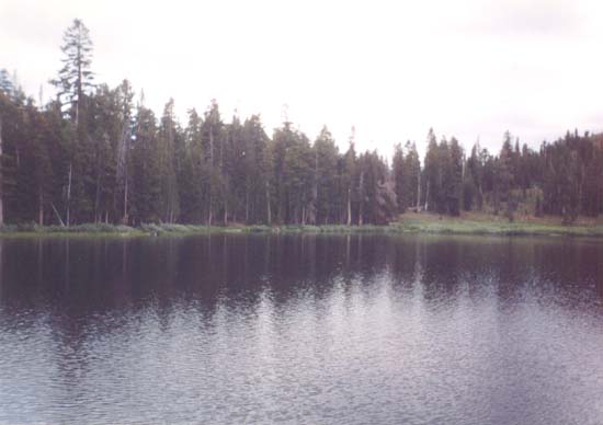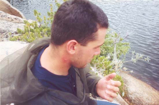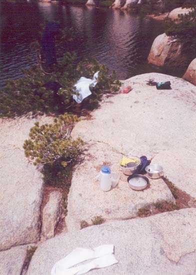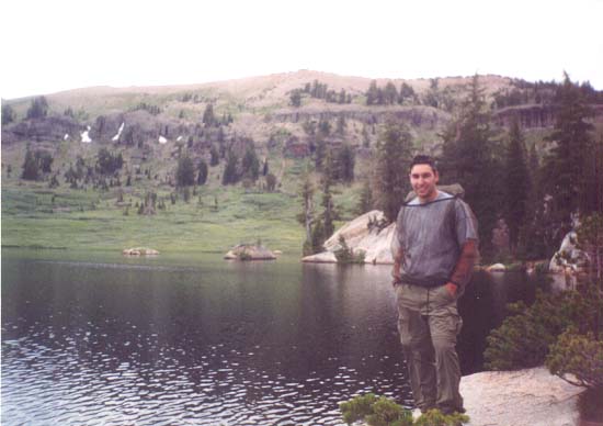 After a few miles, we returned to the PCT and continued heading North. The trail was pretty flat, following the base of the Upper Truckee River Valley. After what seemed like an eternity of walking along flat ground, the mosquitoes finally began to die down toward the North end of the valley, about 1/2 mile from Showers Lake. We finally were able to unzip the hoods of the nets and take the hood off, leaving only our arms/torso covered. I felt much better with the coolness that this brought. Not too long after, the trail began to climb very steeply up the West side of the valley. Fortunately, this climb wasn't too long, and we soon arrived at Showers Lake, 4.5 miles from our previous night's camp, and our lunch point. I was pretty excited that we'd finally reached the lake, and seemingly gotten out of the really bad mosquito territory.