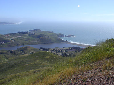 ![]() Looking SouthWest from the top of Hill 88, down on Rodeo Lagoon, Rodeo Beach, Point Bonita, and the Marin Headlands |