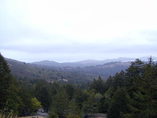 ![]() Looking down toward Muir Beach from Old Stage Road trail (really a big, wide, occasionally paved fire road). Muir Woods is in the valley in the foreground of the picture, and the road to Pantoll can be seen in the bottom of the picture. |